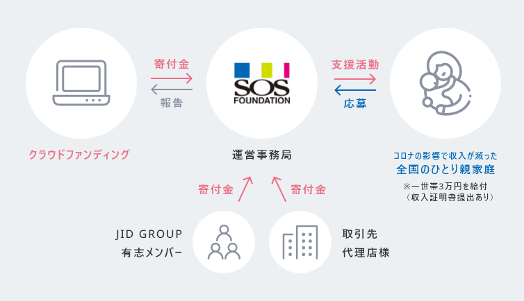 一定の審査のもと、一世帯につき3万円を給付する今回のプロジェクト。皆様からいただいたご寄付は、ひとり親家庭への支援に充てさせていただきます。
