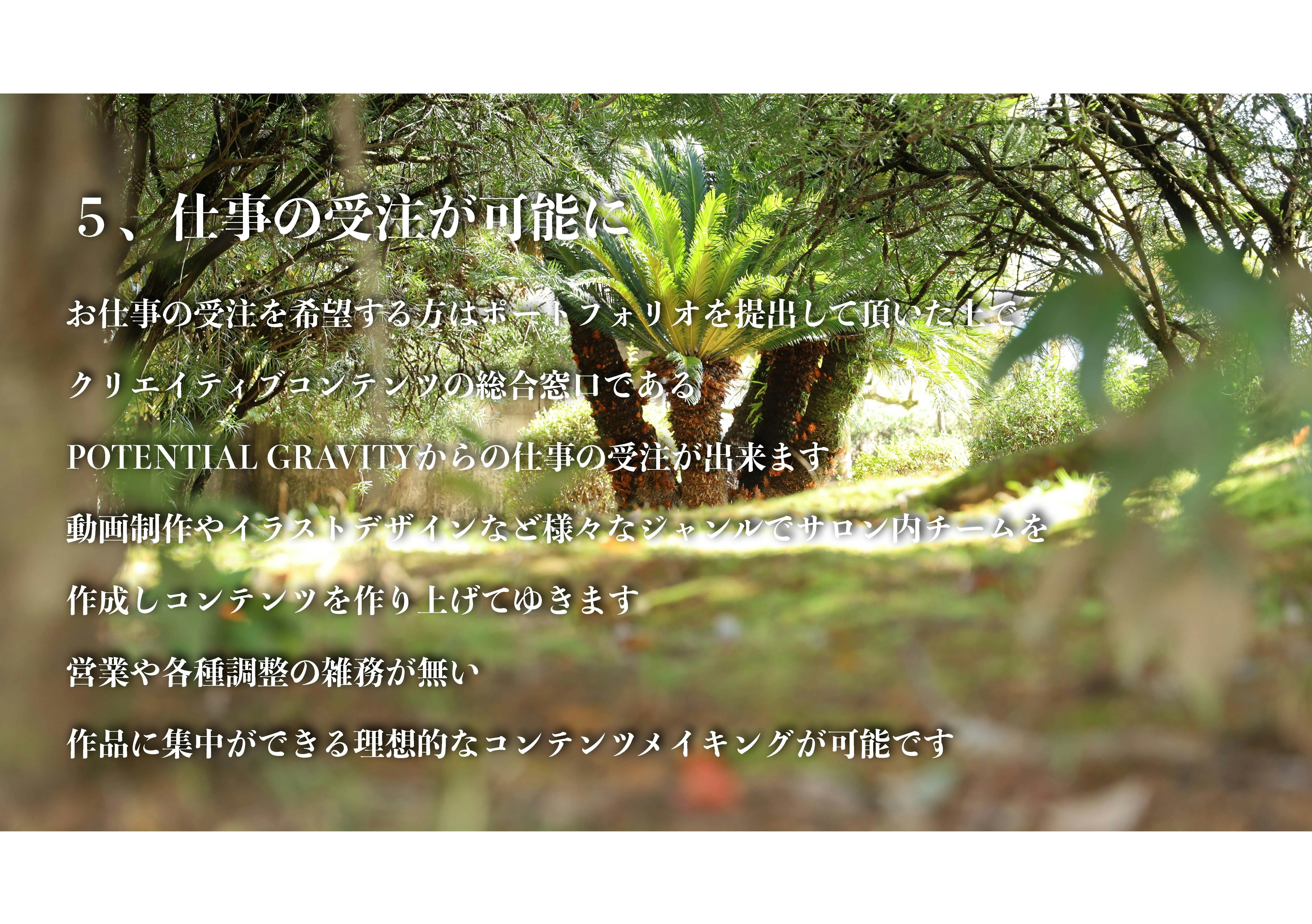 お仕事の受注を希望する方はポートフォリオを提出して頂いた上で、クリエイティブコンテンツの総合窓口であるPOTENTIAL GRAVITYからの仕事の受注が出来ます。