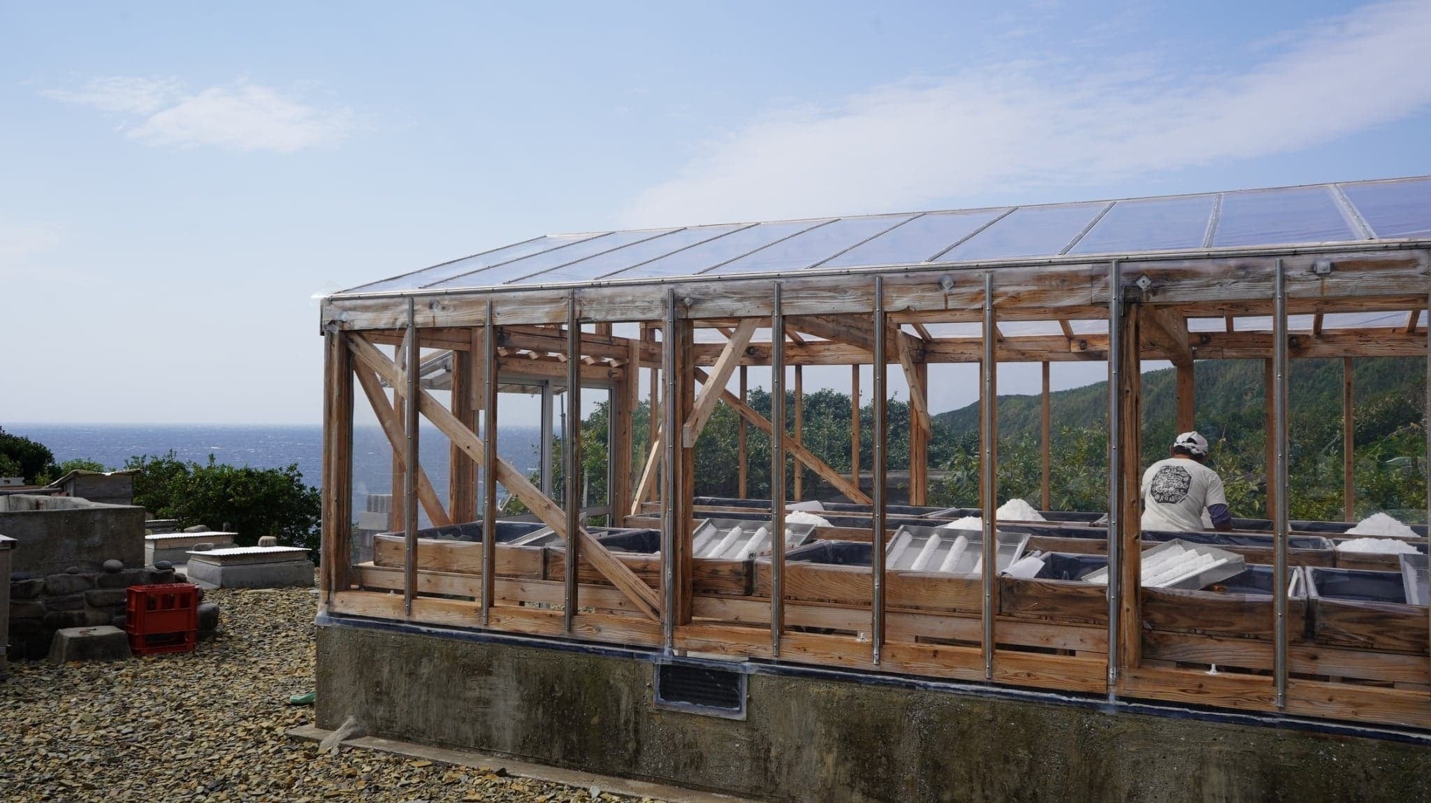 神奈川県で産まれ育ち同郷の主人と結婚しましたがその後すぐに主人が青年海外協力隊に参加。ボリビアで2年間生活し都会での生活に疑問を持ち、少しでも農的生活がしたいと住むところを探す旅に出ました。 ワンボックスカーにテントを積み込み家族4人(長男2才、次男生後6ヶ月)で5ヶ月間の旅の末、移り住んだのがここ種子島でした。 以来地の利を生かした仕事として孟宗竹を使った流下式塩田による天日塩つくりを夫婦でしております。