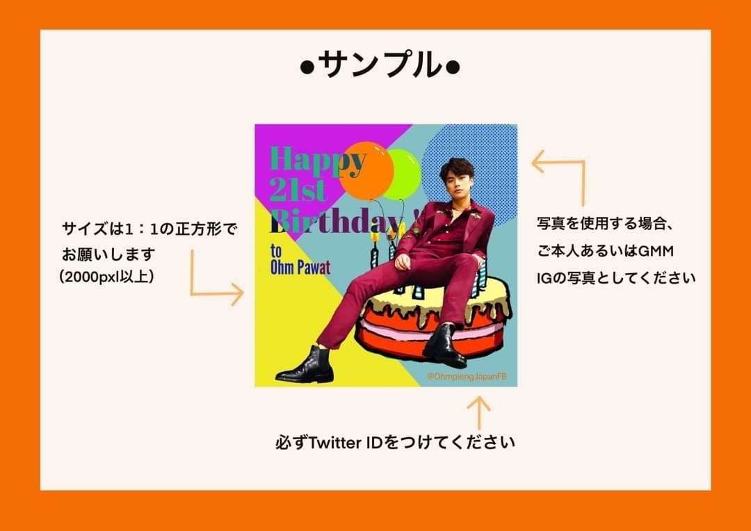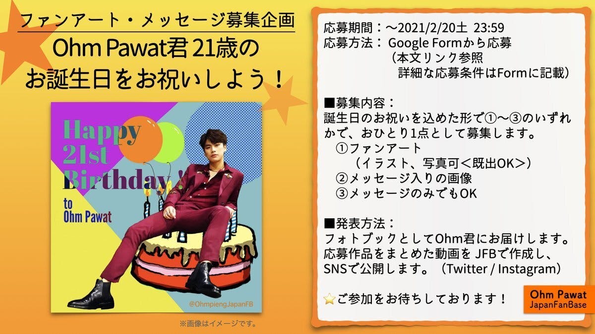 誕生日のファンアートやメッセージは、JFBのTwitter(@OhmpiengJapanFB)上で募集します。