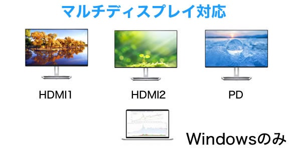 そしてHDMIポートが2つあるためノートPCのモニターもあわせればトリプルモニターとしてご使用が可能です。