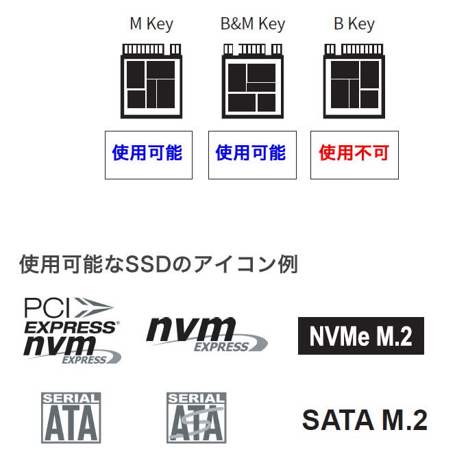 ※M.2 NVMe PCIeMキー/B&Mキー(10Gb/s)b・ M.2 SATA B&Mキー(5Gb/s)