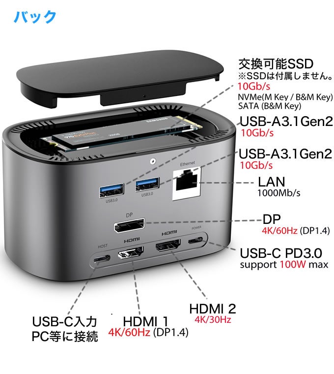 様々な機器との接続をサポートしており、最大の特徴はSSDの交換が可能ということです。