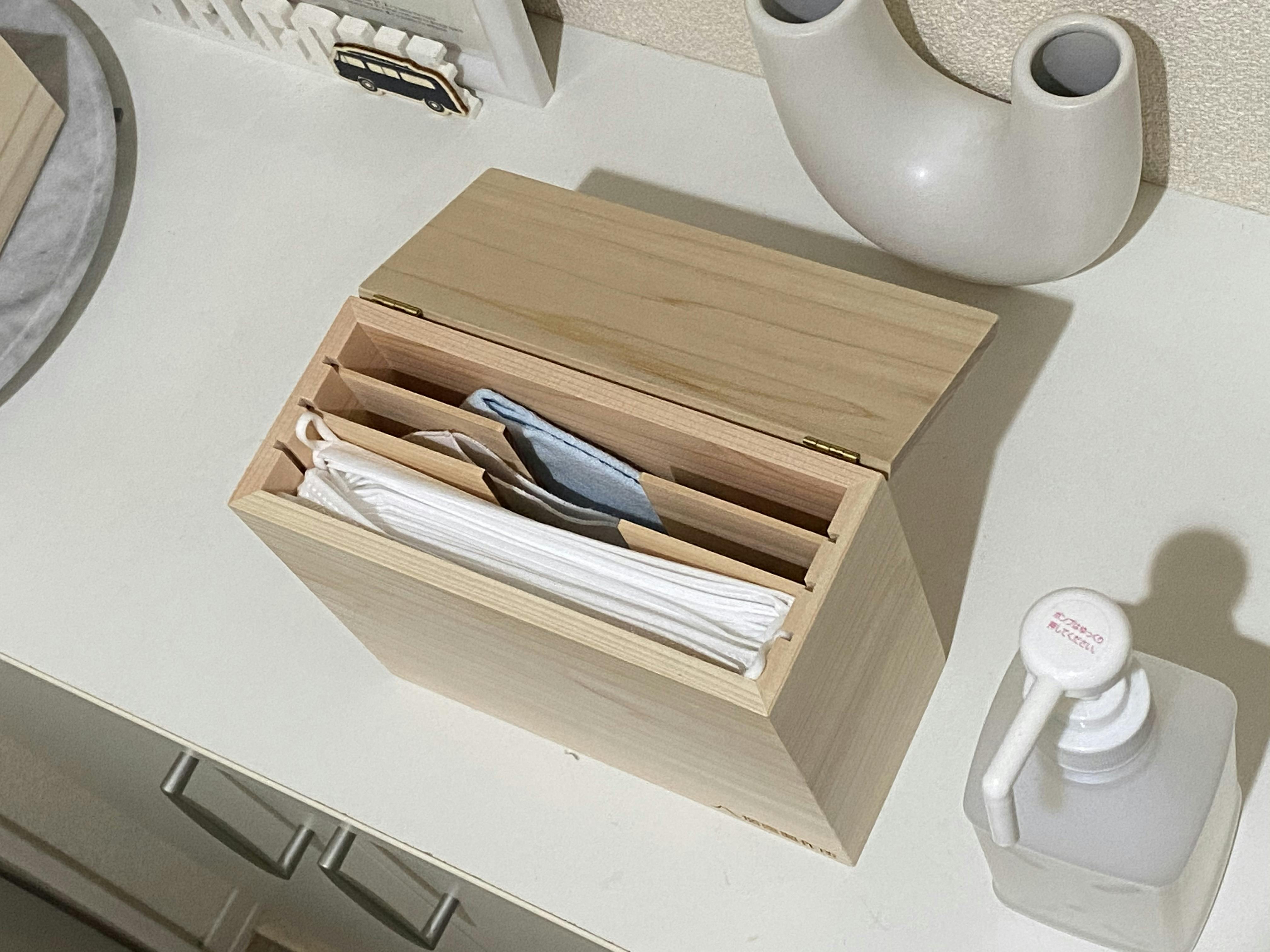 マスクを衛生的な環境で保管することに加え、保管中にヒノキ材の放つ自然な香りをマスクに取り込むことで、マスク装着時には普段の生活をしながら森林浴の気分が味わえます。