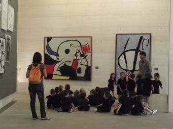 ミロの作品を、幼稚園児と先生が、自由闊達に楽しそうに鑑賞している光景です。