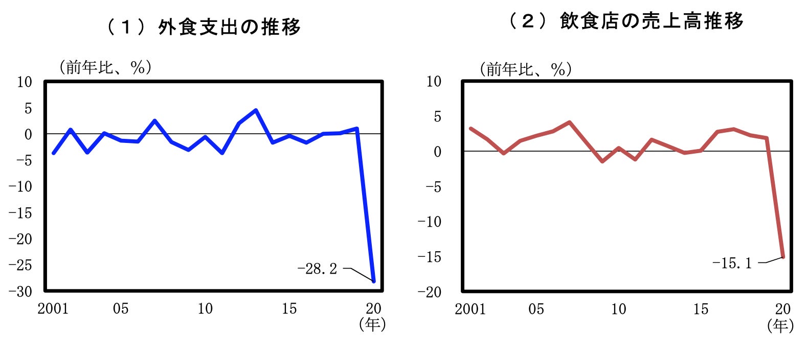 平年に比べて、外食の支出と飲食店の売上高推移が大幅に減少しているのは歴然です。