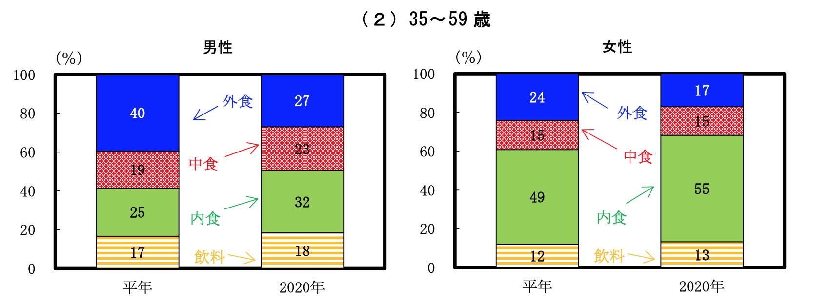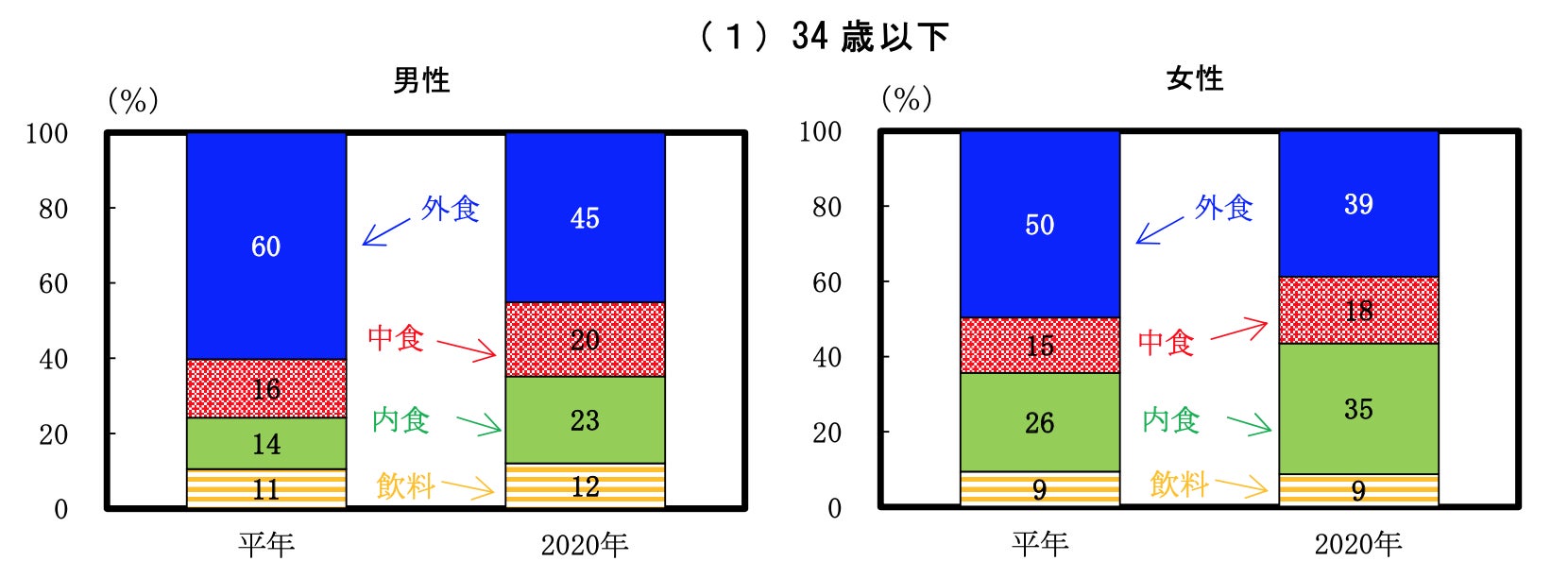 それによって、性別・年齢階級別でみた平年と2020年の食に対する割合の変化が下記の画像になります。