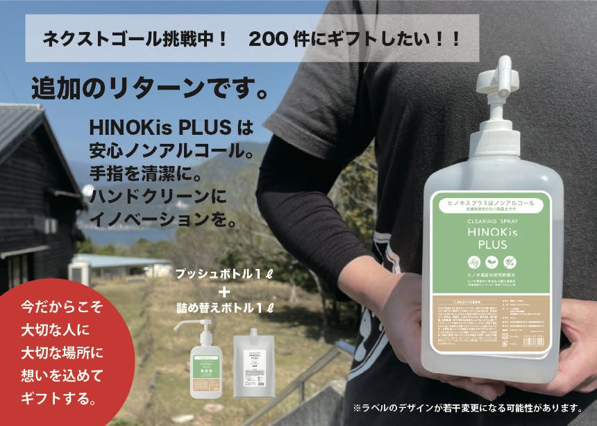 みなさんのおかげで100%達成いたしました。200人の方の大切な200人にヒノキスプラスがギフトされることが何より嬉しいです!