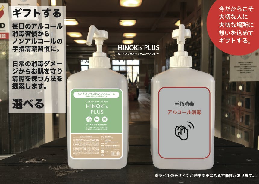 お店に入る時の手指の除菌が、アルコールかノンアルコール、どちらかを選べたらいいよね、という思いでヒノキスプラスの店頭用ボトルポンプを作りました。ノンアルコールという選択肢を提案したい。