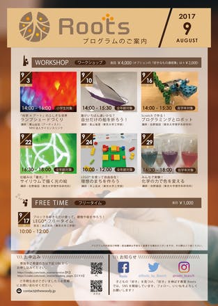 Rootsでは渋谷区代官山に子どもたちの”好き”をみつけ育む小人数制の教室を開講します。科学実験やロボット、絵や動画、デザイン、生物、折り紙... 様々な得意をもった大学生や社会人が結集し、子どもたちが遊ぶプログラムを実施します。