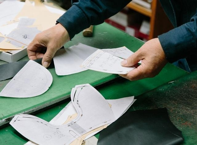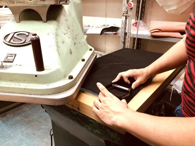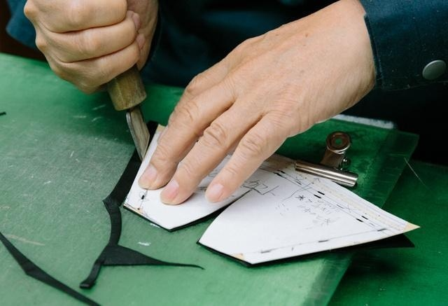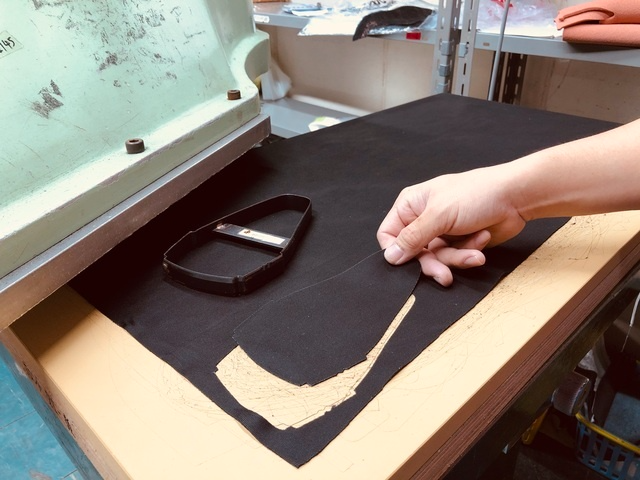 デザイン別に作られた抜き型を使い裁断します。最終的な仕上がりの良し悪しに関わってくるため、天然素材の場合は傷や血筋を考慮しながら慎重に抜いていきます。