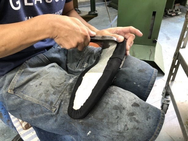 作成したアッパーを木型にかぶせ、「つり込み」という工程で専用の工具を使いながら引っ張って接着していきます。この工程は毎度異なる革の状態と”対話”しながら力加減をしないといけません。