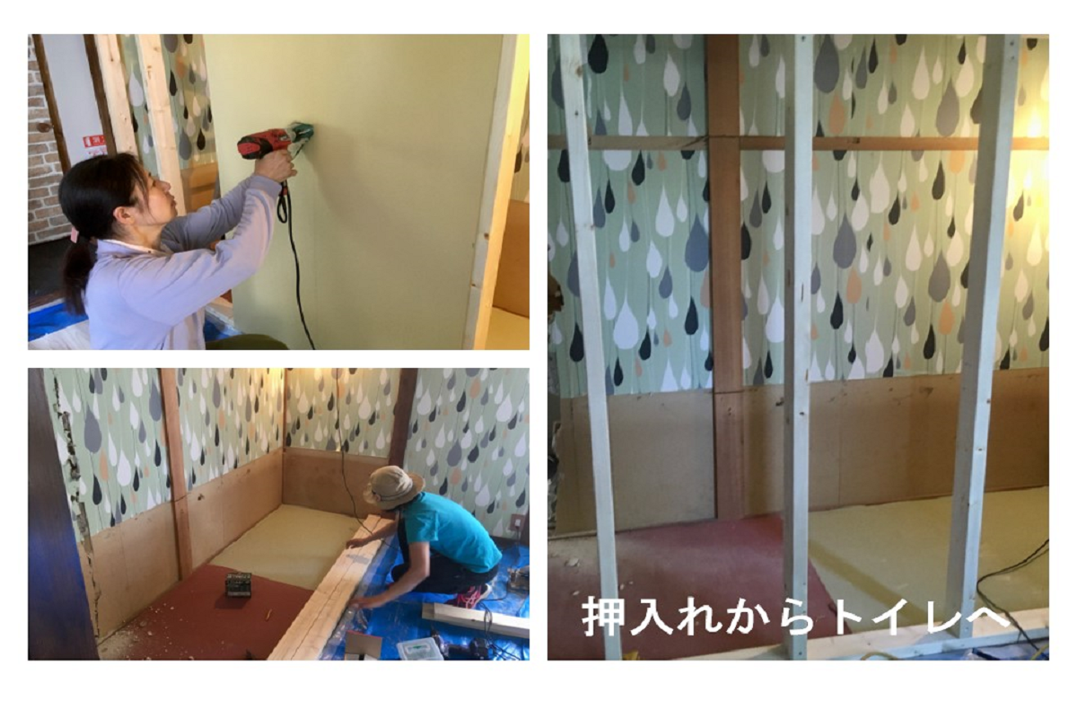 押し入れをトイレスペースへ、和室を洋室へと改装したり、壁のペンキ塗りをしたり、地域の方々のお力をお借りしながら改装作業を行っています。