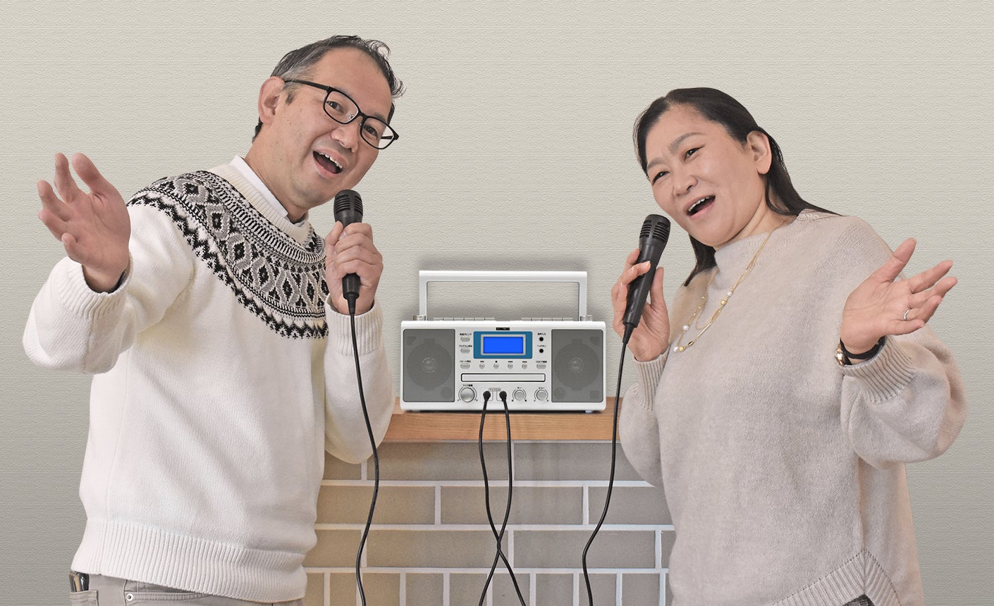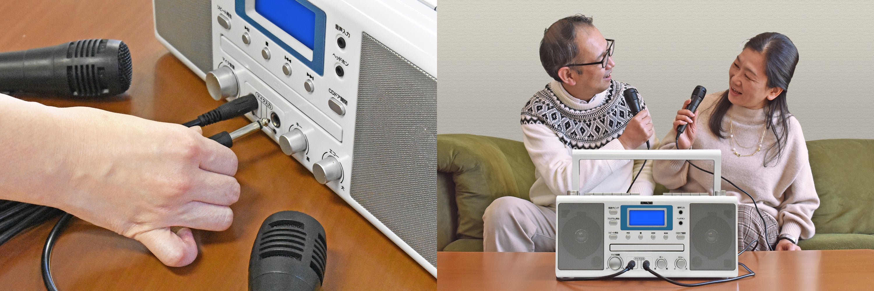 CD再生、カセットテープ録音・再生、AM/FMラジオ受信など、ラジカセとしての基本機能はもちろん、マイクが2本付属していますので、カラオケのCDやカセットテープをお持ちであれば、すぐにお楽しみいただけます。