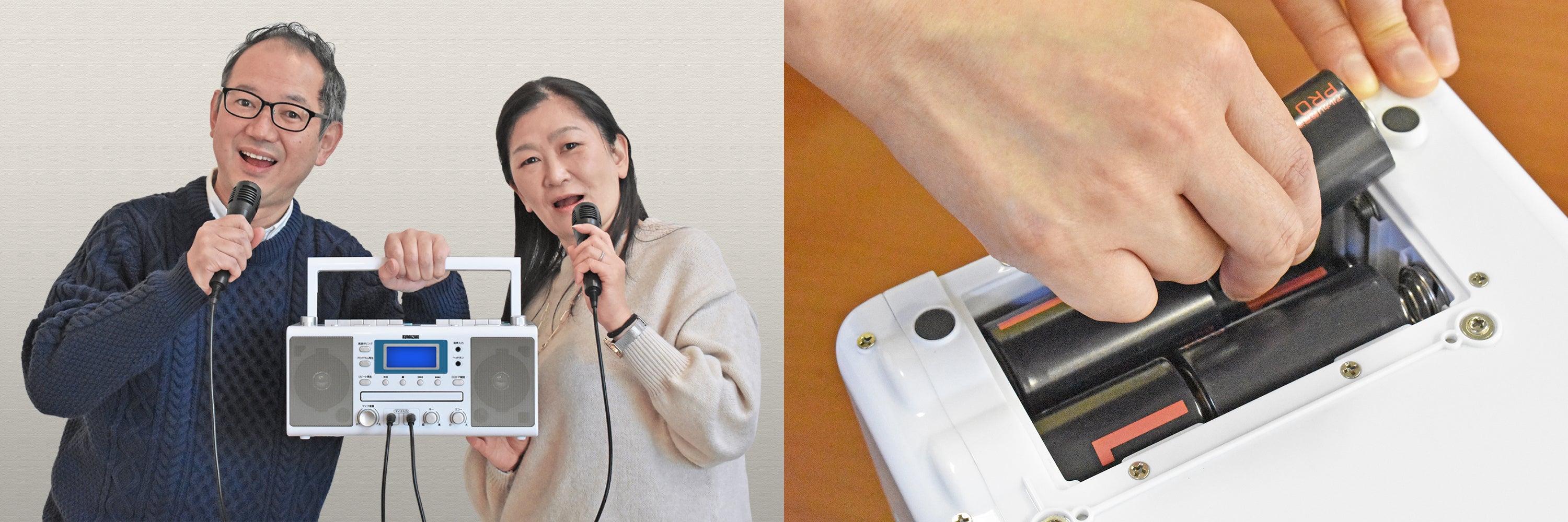 「カラオケCDダブルラジカセ【WUTA(ウータ)】」は家庭用電源はもちろん、乾電池でも動作するので、屋外や稽古場等にも持ち運んでご使用いただけます。便利なハンドル付きなので、持ち運びもラクラクです。