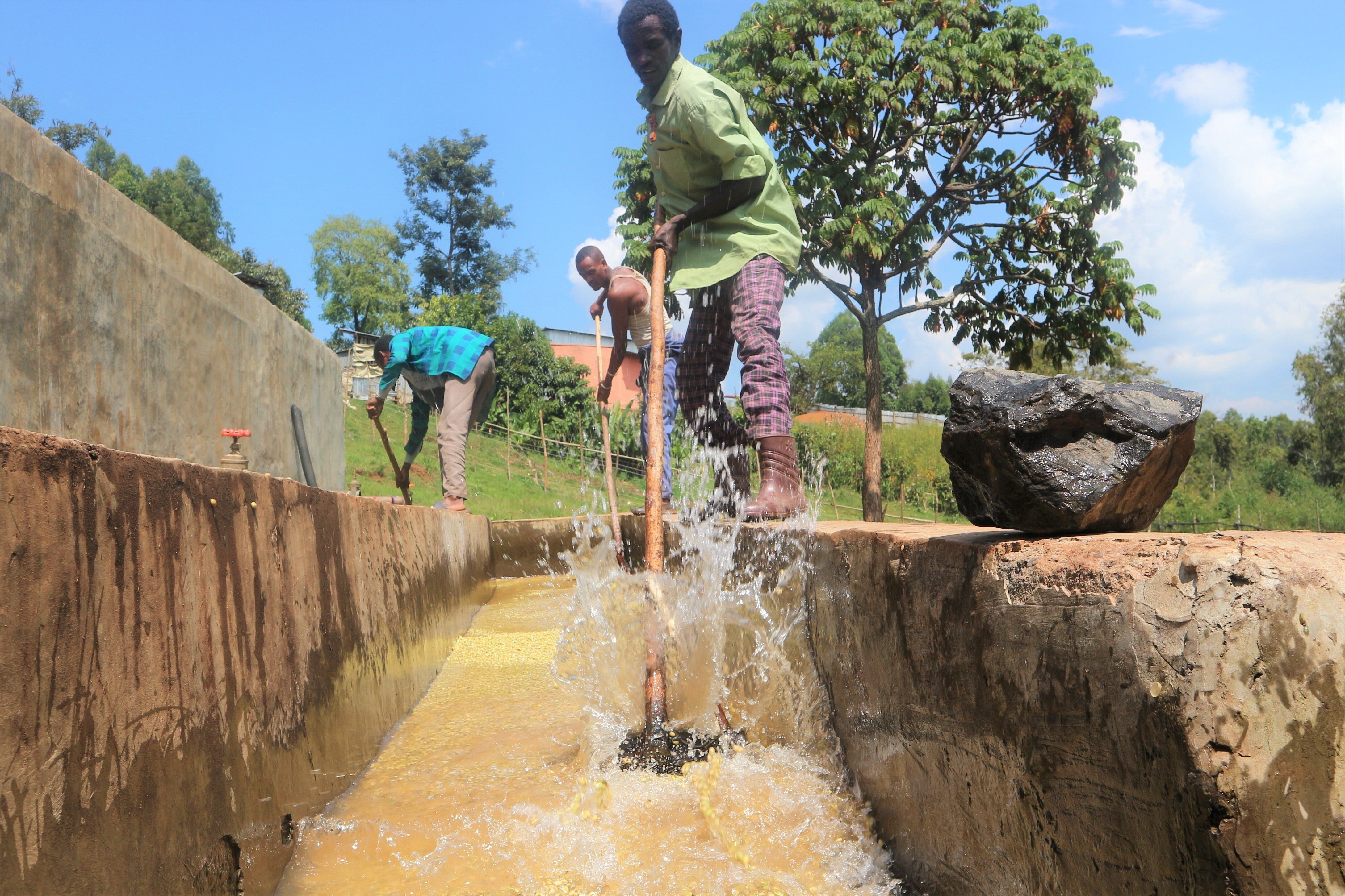 水洗いし、コーヒー豆を流している様子