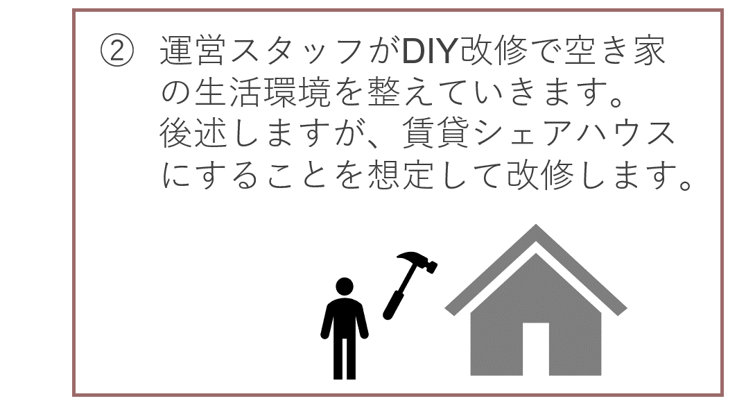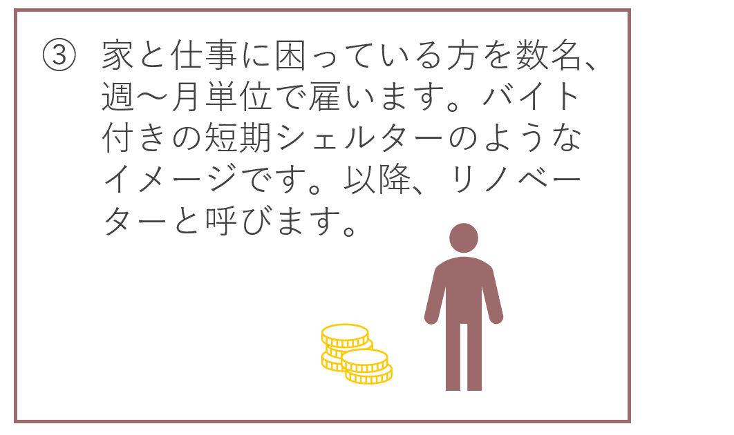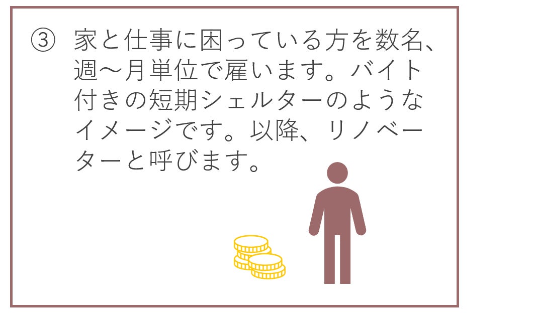 ここでの付加価値とは具体的には、空き家の整理・改修を想定しております。その整理・改修の期間をバイト付きシェルターとして開き、家と仕事に困っている方を受け入れます。そして、そこで生まれた時間と空間をうまく使って、受け入れた方を適切なセーフティネットへ繋げたり、次の仕事に就く支援をしたりします。整理・改修後の空き家は、当社がシェアハウスとして運営し、整理・改修にかかった費用の資金回収を図る予定です。