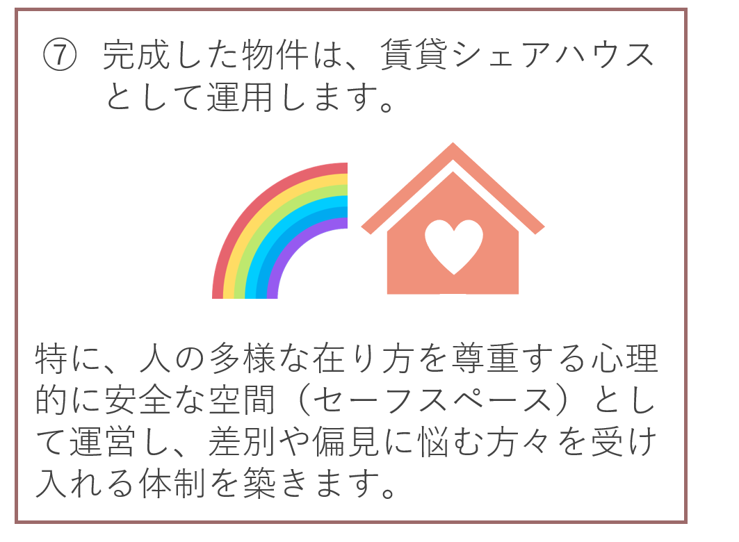 私たちは、改修が終わった後の物件について、誰もが尊重されるセーフスペース(心理的に安全な場所)として運営することで、この問題にもアプローチしていきたいと考えています。