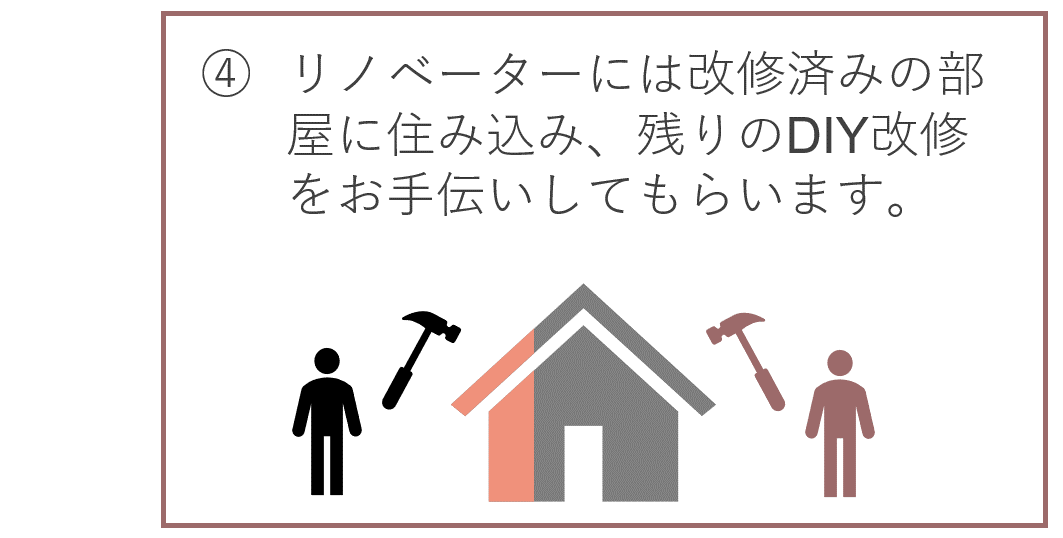 A. 建築関連の専門的なサポートをしてくださる方々と複数繋がっており、その監修・助言をもとに改修を進めます。DIYでは改修出来ない部分については外注も検討します。