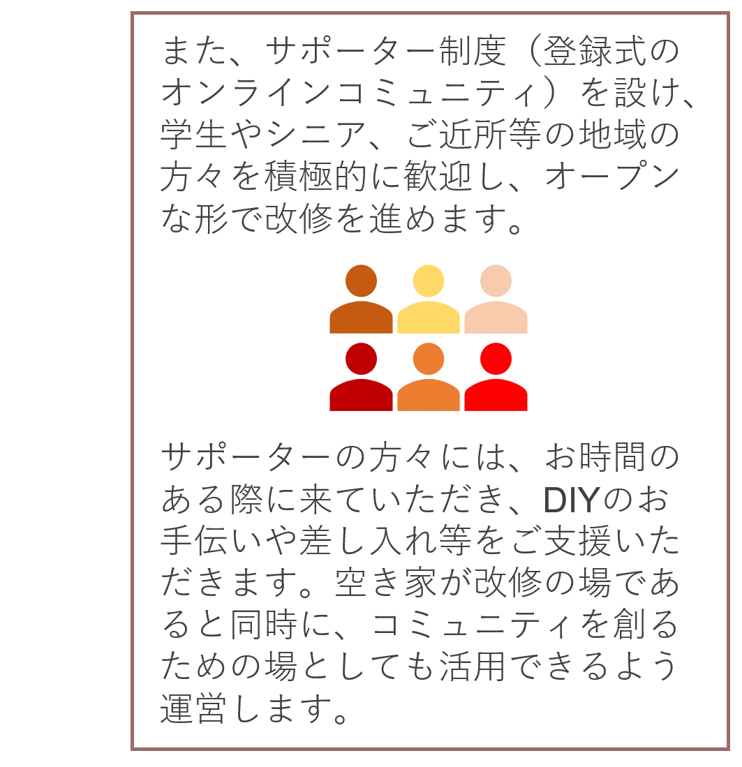 応援していただいた皆様に、心を込めたお礼のお手紙を書かせていただきます。リノベーター(被支援者)の方にも、可能であれば一筆いただく予定です(手書きのもののコピーを想定)。