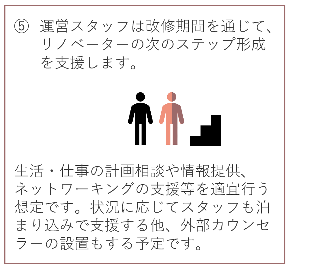 A. 改修は運営メンバーが中心となって実施します。リノベーターの方々にはそれをお手伝いしてもらいます。