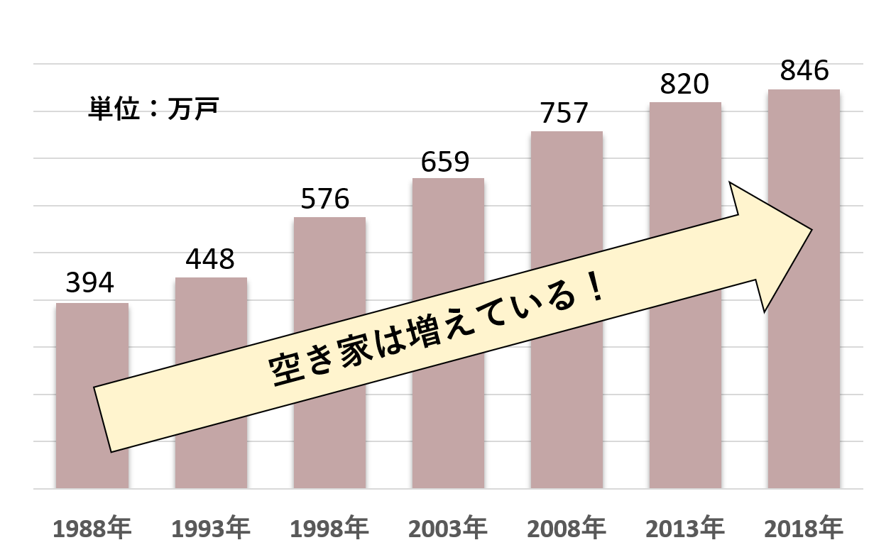 総務省による2018年の調査では、全国で846万戸(全体の約13.6%)あるとされています。この数は例年増加傾向にあり、野村総研では2033年には全国の戸建てのうち3分の1が空き家になると予測されています。