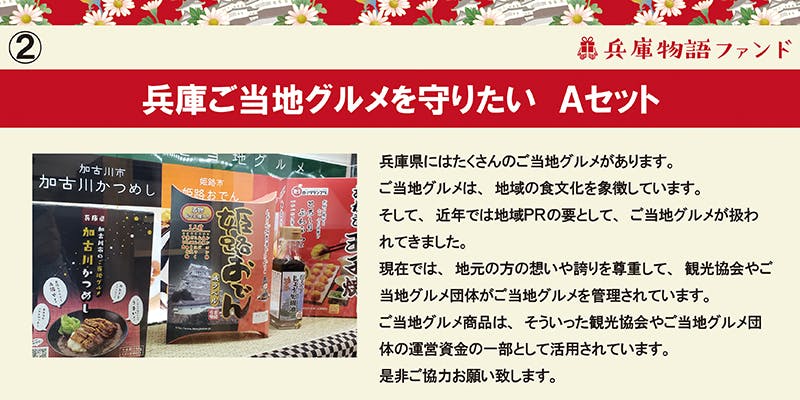 ①地域の一つの財産である、兵庫県のゆかりある商品を製造、販売する事業社様の過剰在庫の負担を少しでも是正し、今後の事業継続の足掛けとなるファンドとなる