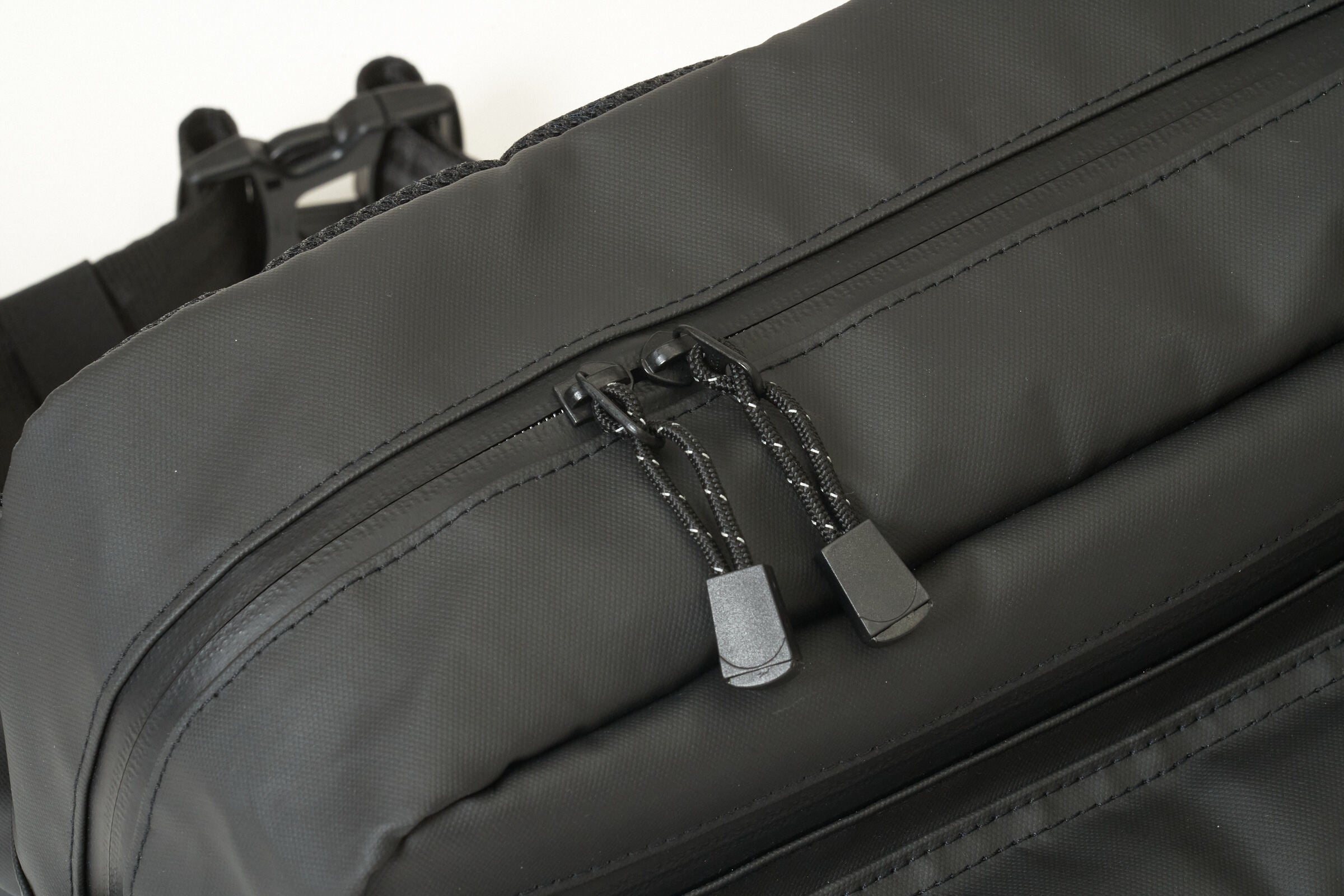 耐水圧24,000mmの【軽量性・耐摩耗性・耐劣化性耐・防水性】を保持した高機能素材crystal PROTECTIONを使用していますので、止水ファスナーとのコラボレーションで防水性が格段に向上しました!(注意)ファスナーは止水仕様をしており且つ素材は耐水圧に優れた防水機能を有しています。しかしながら、バッグ構成においては通常の縫製を施していますので完全防水ではございません。
