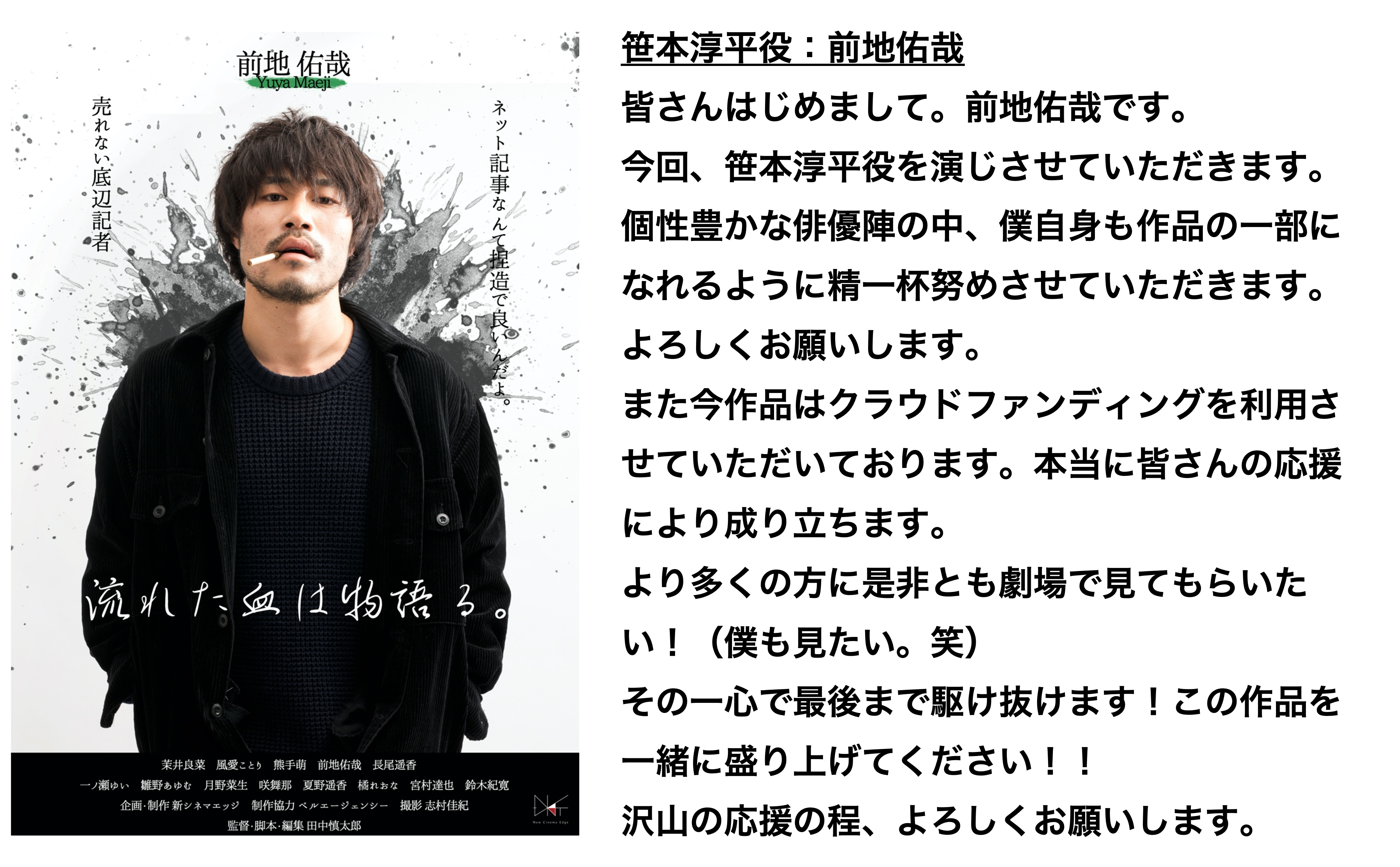 2021/03/26 09:54ご覧いただきありがとうございます!映画『流れた血は物語る。』のクラウドファンディングの募集が残り6日間となってしまいました。2月中旬からこのクラウドファンディングがスタートしましたが、あっという間でした。ご支援いただきました皆様、本当にありがとうございます!非常に嬉しい思いでいっぱいです!さて、本題に入ります。なんと本作の台本が到着しました!改めて手に取るといよいよ始まるんだなという高揚感が出てきますね!私も非常にテンションが上がってきました!これからリハーサルを重ね、本番にベストな状態で臨みます!撮影風景なども随時活動報告に上げたいと思います。そしてこの作品が、国内のみならず世界に羽ばたいて行けるよう頑張ります!今後とも応援よろしくお願い致します!作品完成をお楽しみに!新シネマエッジ もっと見る