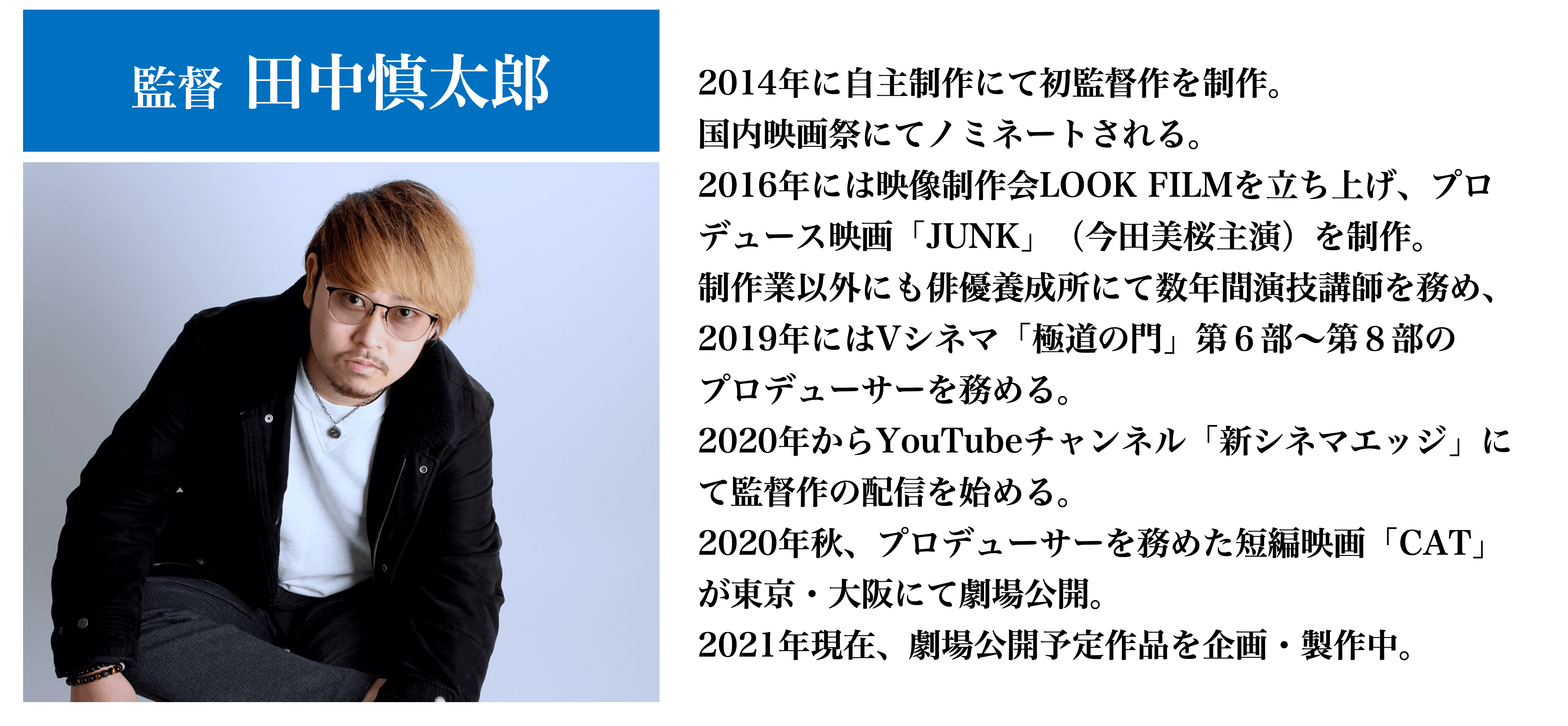 ”新シネマエッジ”は、日本のみならず世界に向けて映像作品を発信していくことを目標に、2020年4月に監督の田中慎太郎がカメラマンの志村佳紀、俳優の前地佑哉を召集し発足しました。現在は他3名が加わり若きクリエイター6名で活動しております。