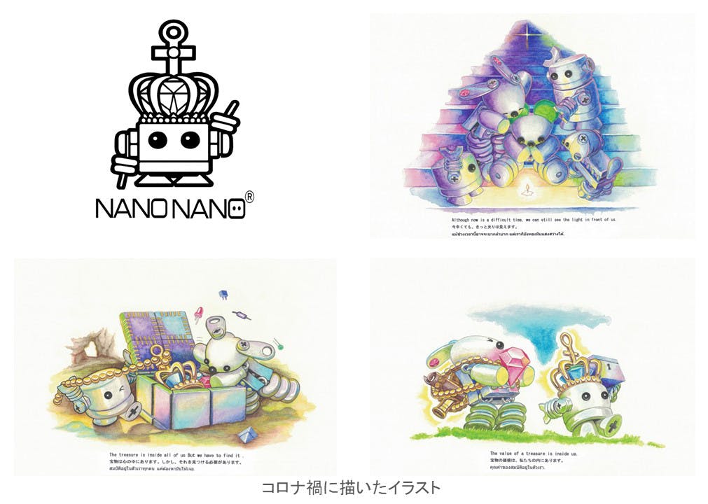 2019年夏NANONANOを続けるためバンコクに移住し、2020年1月NANONANOの会社を設立しましたが、2月下旬から新型コロナウィルスのためアートイベントの中止やミュージアムショップの休業などで収入が途絶えました。それで、生活のためNANONANOを取り付けられるマスクをデザインしてアトリエで製作、販売などしながら、NANONANO作品を作っております。