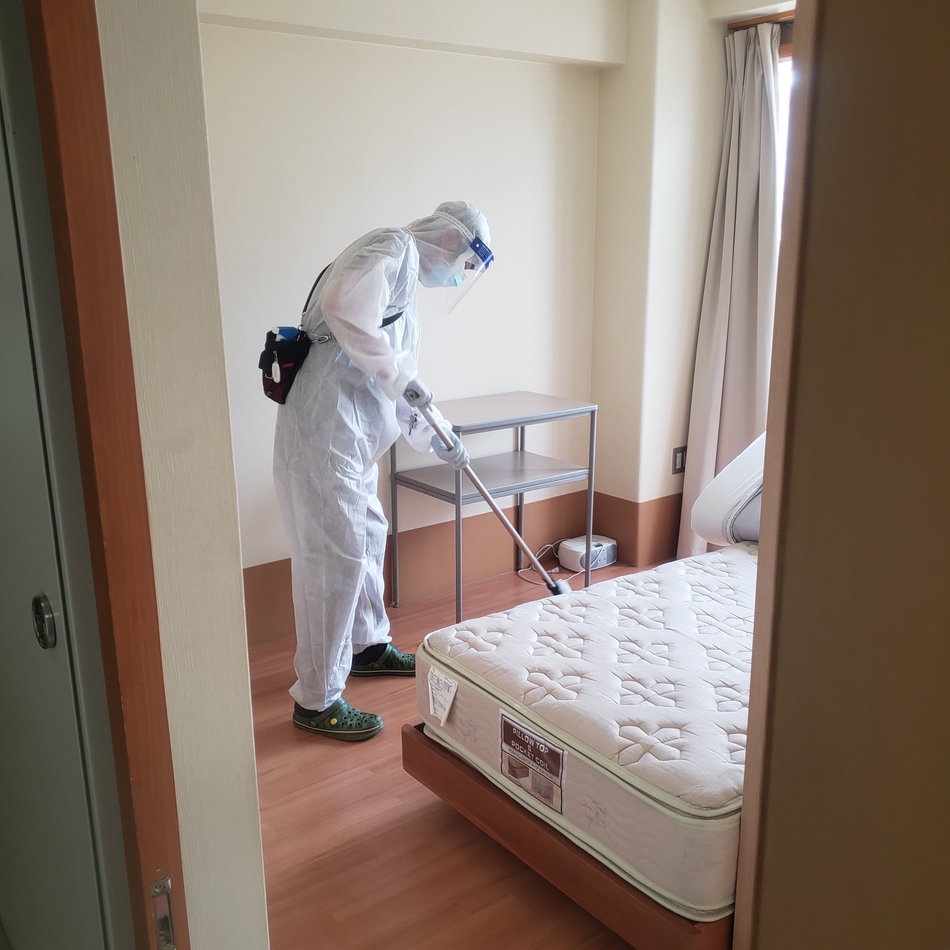 〈防護服を着て施設の消毒作業中〉