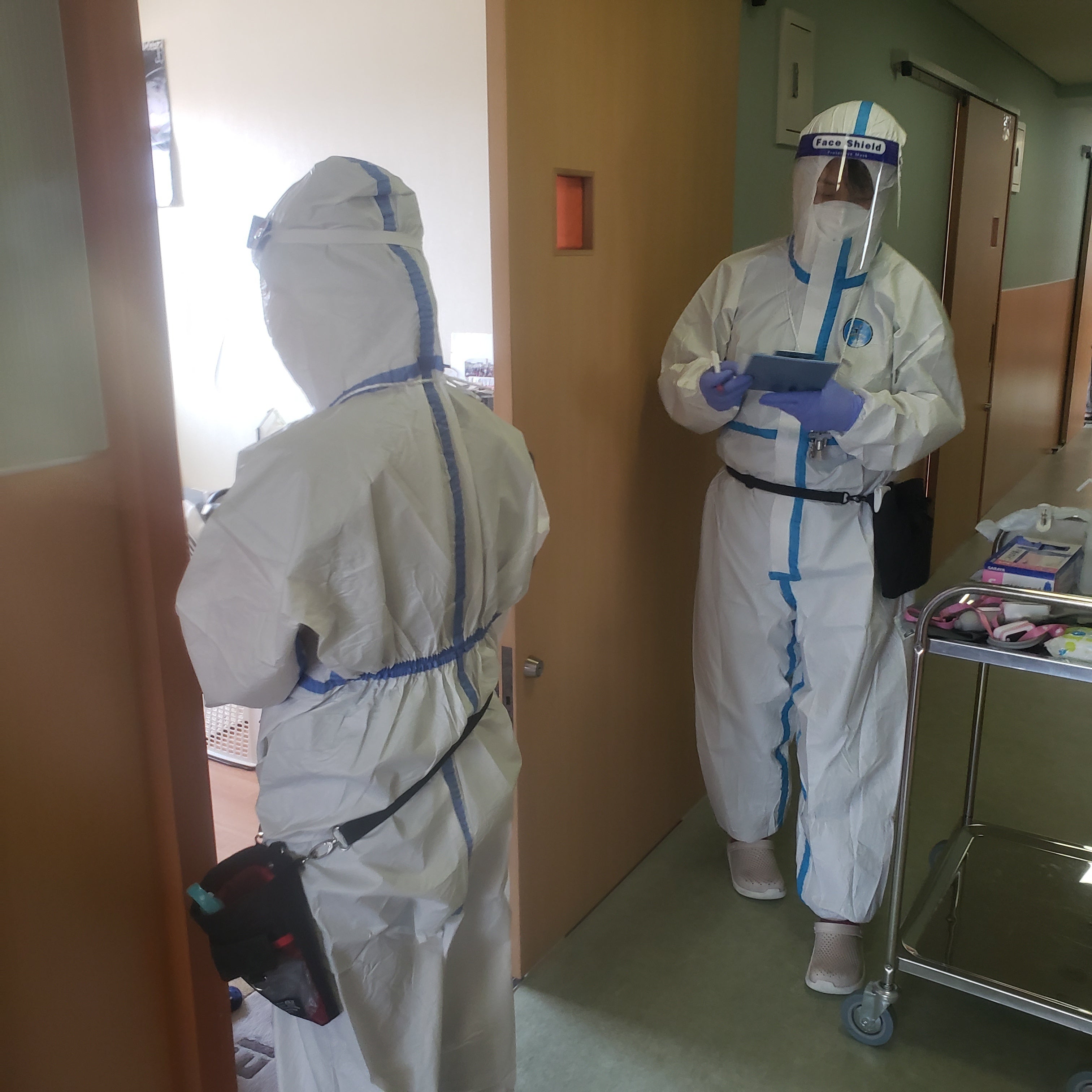 〈施設スタッフが防護服を着ている姿〉