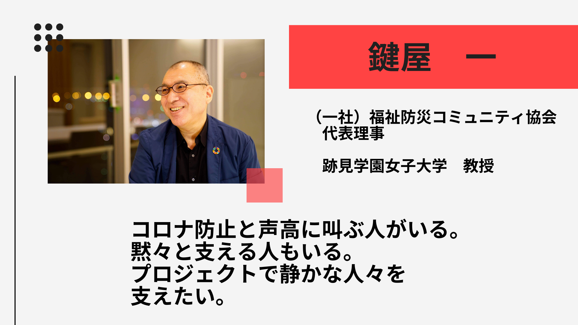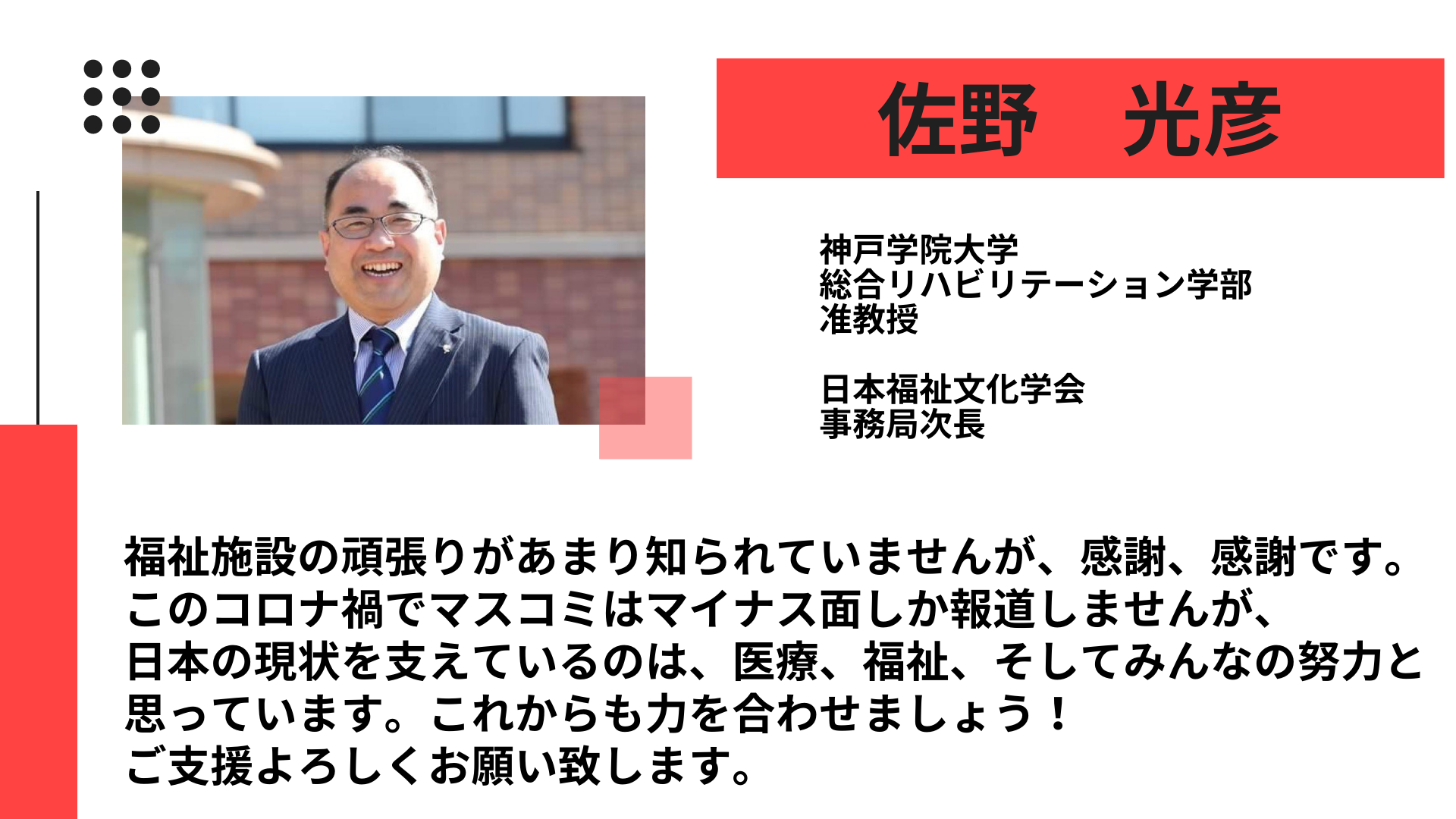 新型コロナウィルス感染症は人や社会の弱いところ、経営基盤の弱さ、健康状態の弱さを鋭く突いてきます。この両方の弱さを併せ持つ障がい者支援施設は現在、大変厳しい状況にあります。
