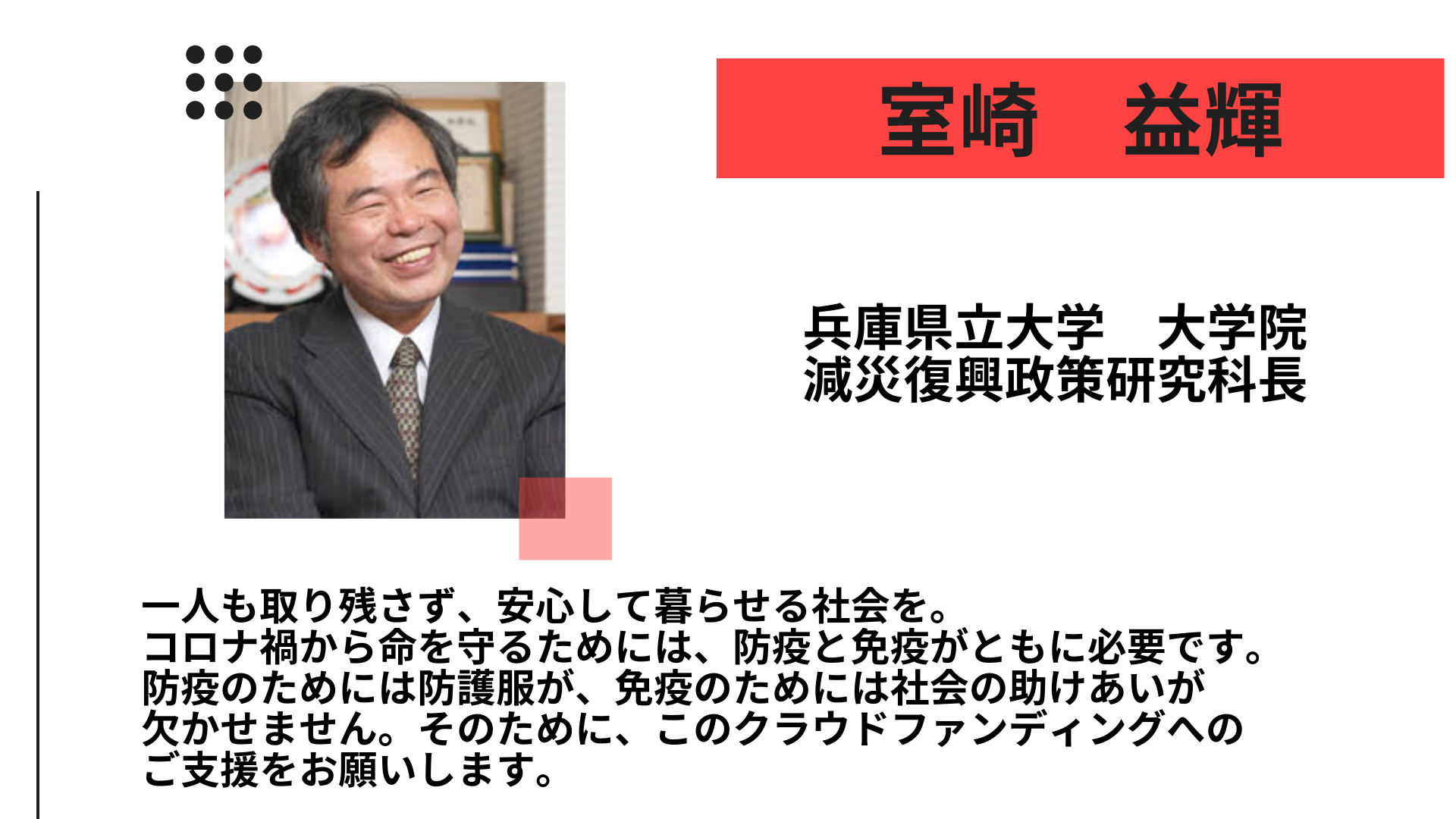 2021/02/27 12:28クラウドファンディング最終日となりましたが、現在多くの支援者の方から応援頂いております。応援頂いた一つ一つの支援の奥にある温かいお気持ちに感動しております。コロナ禍に障がい者施設で起きている現状を少しでも知って頂きたいとの気持ちからスタートしたクラウドファンディングでしたが、障がい者施設で働いている方々の大変な現状を知ることで障がい者施設における防災・減災の課題を見える化するきっかけになりました。様々なリスクから施設の利用者を守るためにはリスクについて知っておく必要があります。新型コロナウィルスの被害によって「リスクは災害だけではなく、様々な形で現れる」という事を学ぶことができました。社会が事業を継続していく為にリスクを把握し、対策を計画しておく必要性が今まで以上に求められるようになり、社会の構造が変わってきていることを感じます。いつの時代でも人と人とのネットワークによる繋がりは大きな力を持っています。今回のクラウドファンディングで繋がったネットワークは、今後の福祉業界でもプラスになるつながりだと確信しています。残り僅かな時間ですが、少しでも障がい者施設への支援がつながるように皆様のご支援宜しくお願い致します。 もっと見る