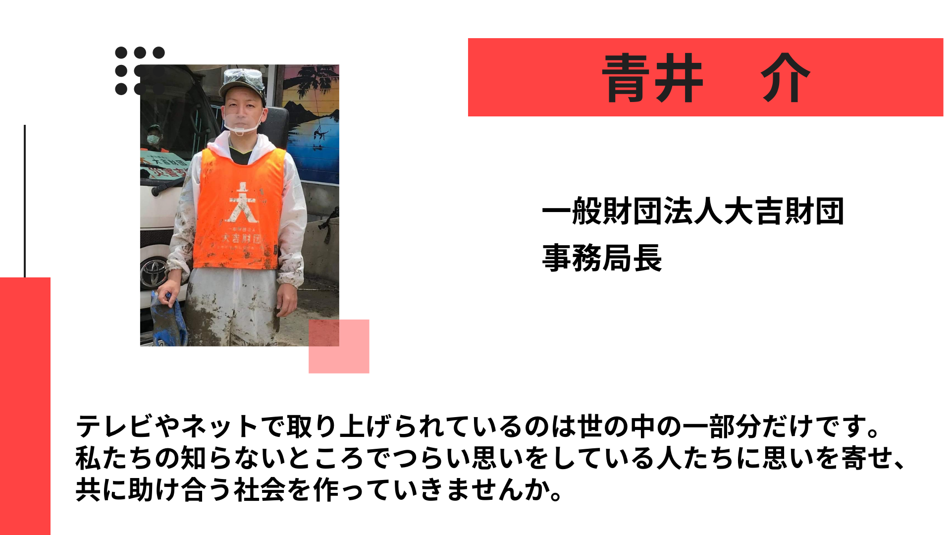 活動の一つとして福祉施設(障がい者施設、高齢者施設など)での防災啓発セミナーや防災計画作り、備蓄品の整備などを行っており、日ごろから福祉施設関係者の皆さまとの交流を頂いております。