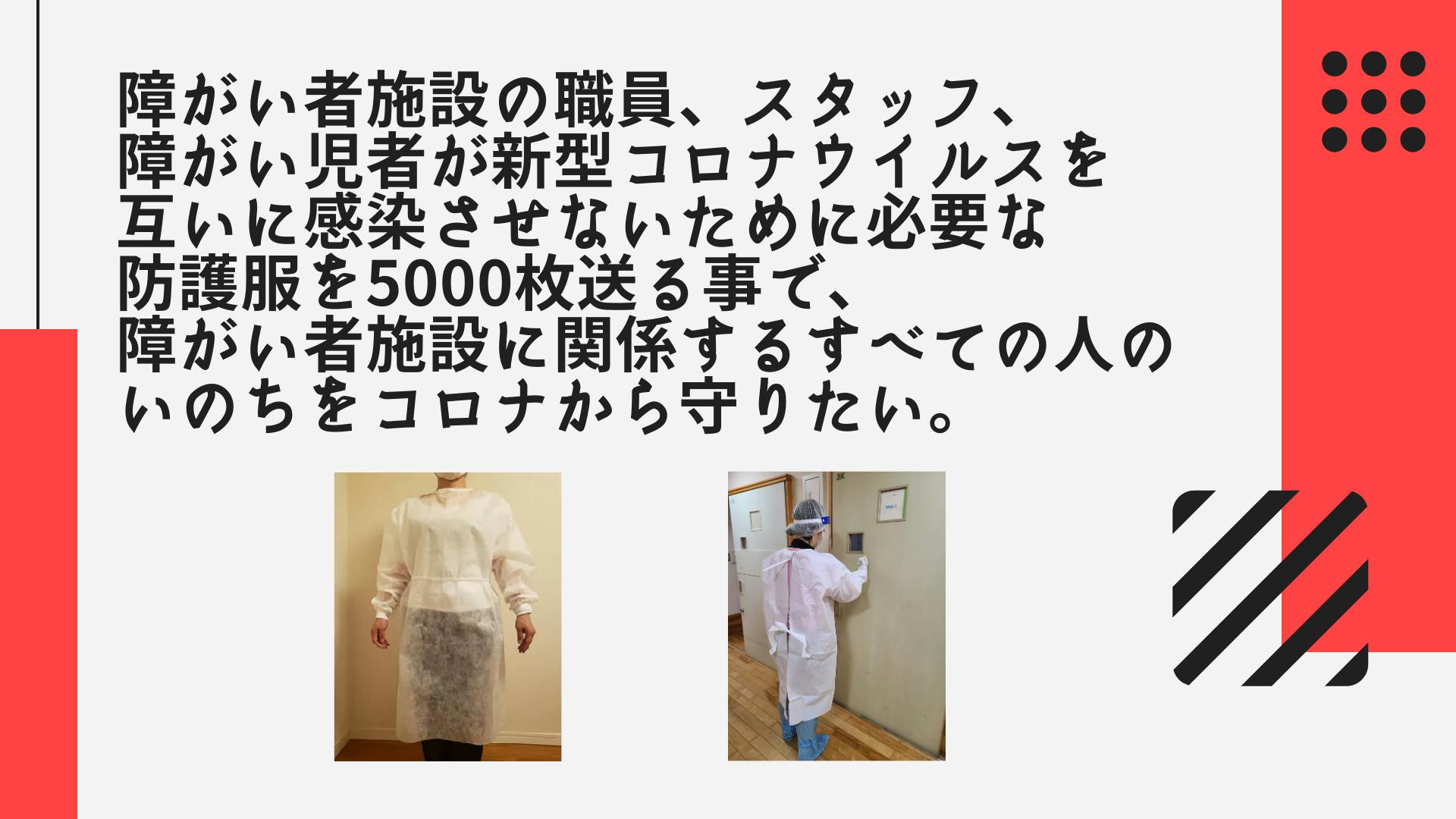職員や障害のある方々が新型コロナウィルスを互いに感染させないために必要な防護服を5000枚送る事で、障がい者施設に関係するすべての人のいのちを守りたいのです。