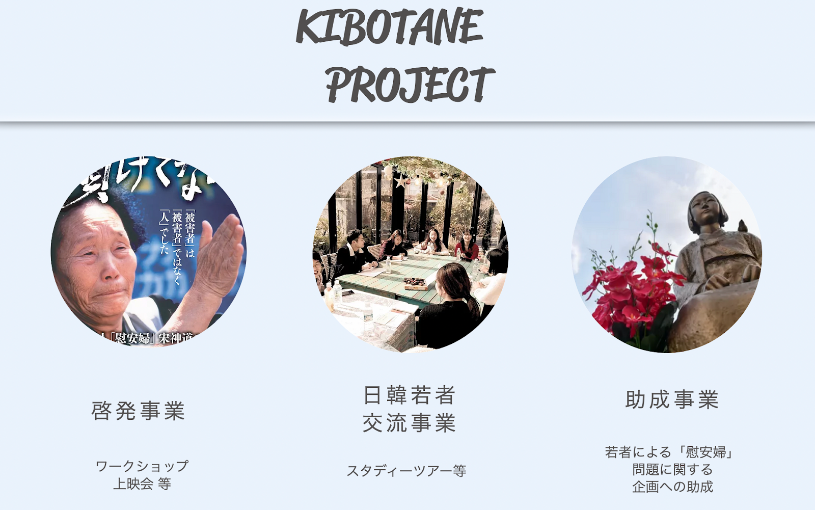 このプロジェクトをおこなう私たちは「希望のたね基金」(通称「キボタネ」)という一般社団法人で、2017年に設立されました。キボタネは、日本の若者が「慰安婦」問題について学び、性暴力のない社会づくりに役立てるための基金です。「終わらせる」のではなく、「記憶・継承」することで、二度と同じような被害を生まない社会をつくることができると信じて、様々な活動をおこなってきました。この本の翻訳出版は、そのような活動の一環です。