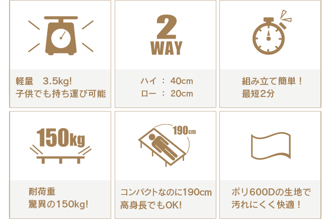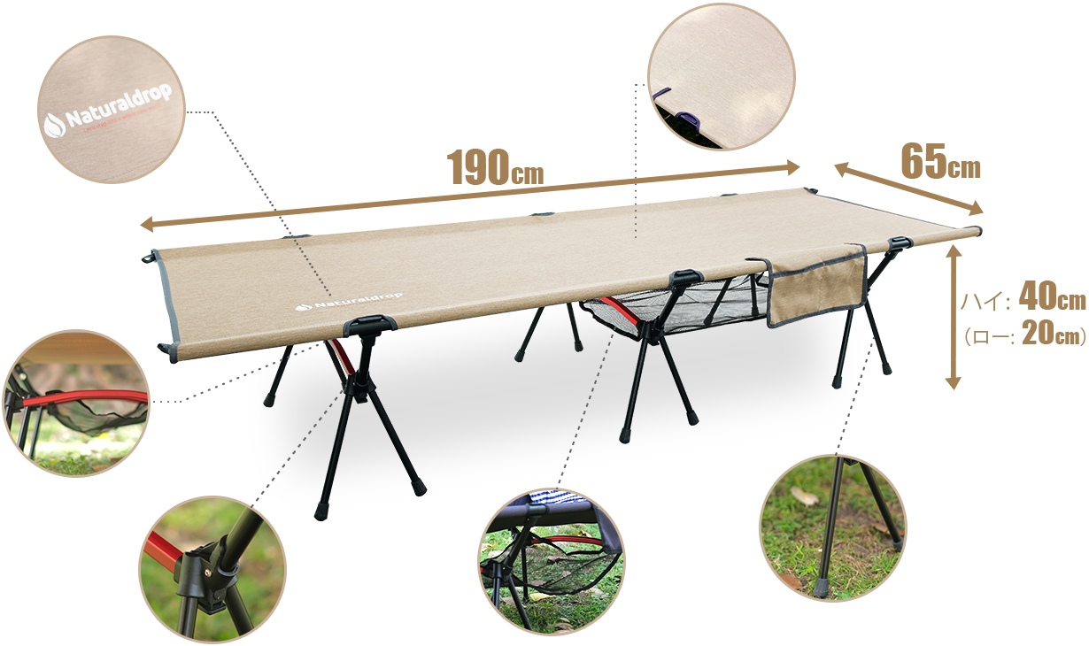 キャンプブームはこれからさらに広まり、市場に多く出回るようになるでしょう。中には安価で、購入しても使えないような品が現れる可能性もあります。ハイ/ローの2WAYで、様々な用途に合わせて利用でき、さらには安心して使えるNaturaldropのコットが遥かに経済的です。