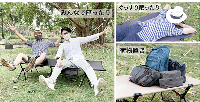 屋外、室内の簡易ベッドとしてはもちろん、椅子として、荷物置きとして、車内でも、もっと便利に使えます。