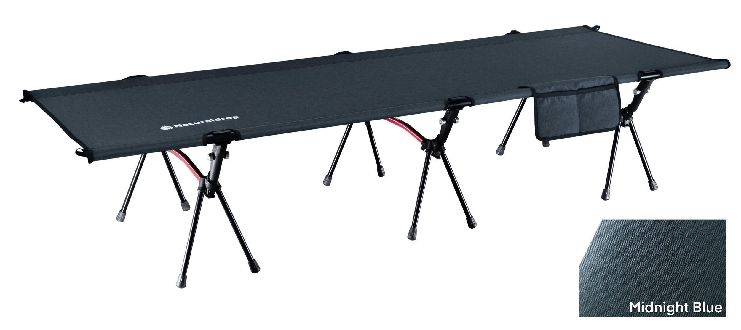 Naturaldropのコットは、デザイン性も重視。重量感のあるブラックと、鮮やかなレッドの組み合わせのベースフレーム。5色のベッドクロスはアウトドアのシーンに馴染みながらも彩りを添えます。