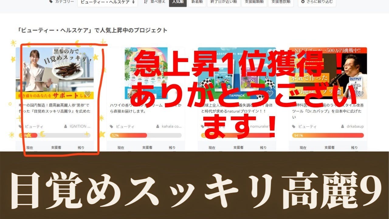 2021/04/13 10:33皆さまのおかげでビューティ・ヘルスケア部門で急上昇プロジェクト1位を獲得出来ました。本当に製品力に拘りコスパも良く、環境にも人の身体にも優しい無農薬、無添加で更に唯一の国内生産の最高級高麗人参である黒参を使用し作りました。今日はネーミングについてお話ししたいと思います!今、日本で最高級高麗人参として販売されているのは殆どが1回蒸して1回干した紅参てすが、目覚めスッキリ高麗9で使用している黒参は9回蒸して乾かしているので手間と成分が紅参よらは5倍以上増えるんです。それを強調したかったので目覚めスッキリ高麗9としました。何も手を加えない水参からだと50倍近くサポニンと呼ばれる有効成分が変わります。まだ、高麗人参を飲んだ事がない。今まで高麗人参を飲んだけど効き目が分からなかったという方にも是非お試しいただきたいです。最高40%オフでお買い求めできるチャンスです。 もっと見る