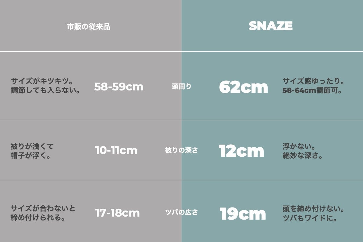 SNAZEなら、アジャスター付きであることはもちろん、頭周りの長さだけでなく、被りの深さやツバの長さや幅までシルエットを追求。