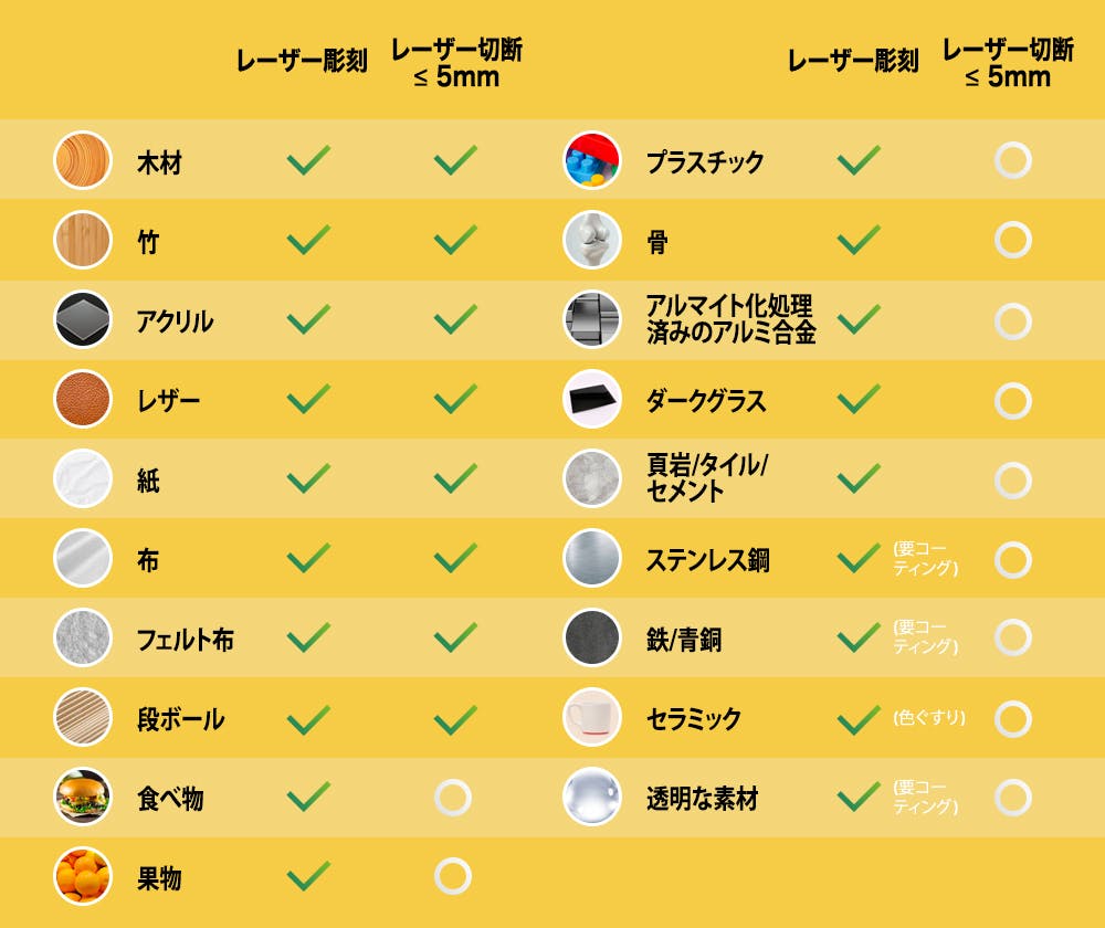 LaserPecker 2は、金属、ダークグラス、着色セラミック、木、竹、レザー、紙、果物、食品、プラスチック、アクリル、石、セメント、骨など、事実上すべてのものに彫刻できます。