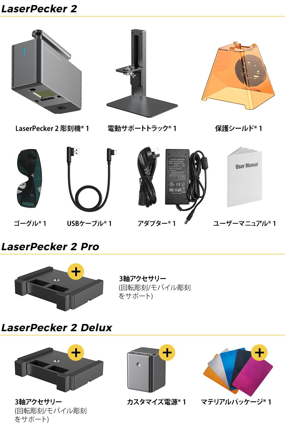 *LaserPecker 2 Max: 彫刻機本体+保護カバー+電動ブラケット+第三軸+大容量バッテリー+バッキングプレート+素材パッケージ+彫刻機収納ケース+第三軸収納ケース+バッチ彫刻装置)