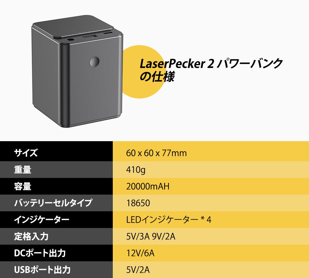 LaserPecker 2には、専用のコンパクトなパワーバンクもあります。そのため、LaserPecker 2をどこへだって持って行けます。電池が切れたとしたとしても、そこから給電すればまたすぐに作業に戻れます。