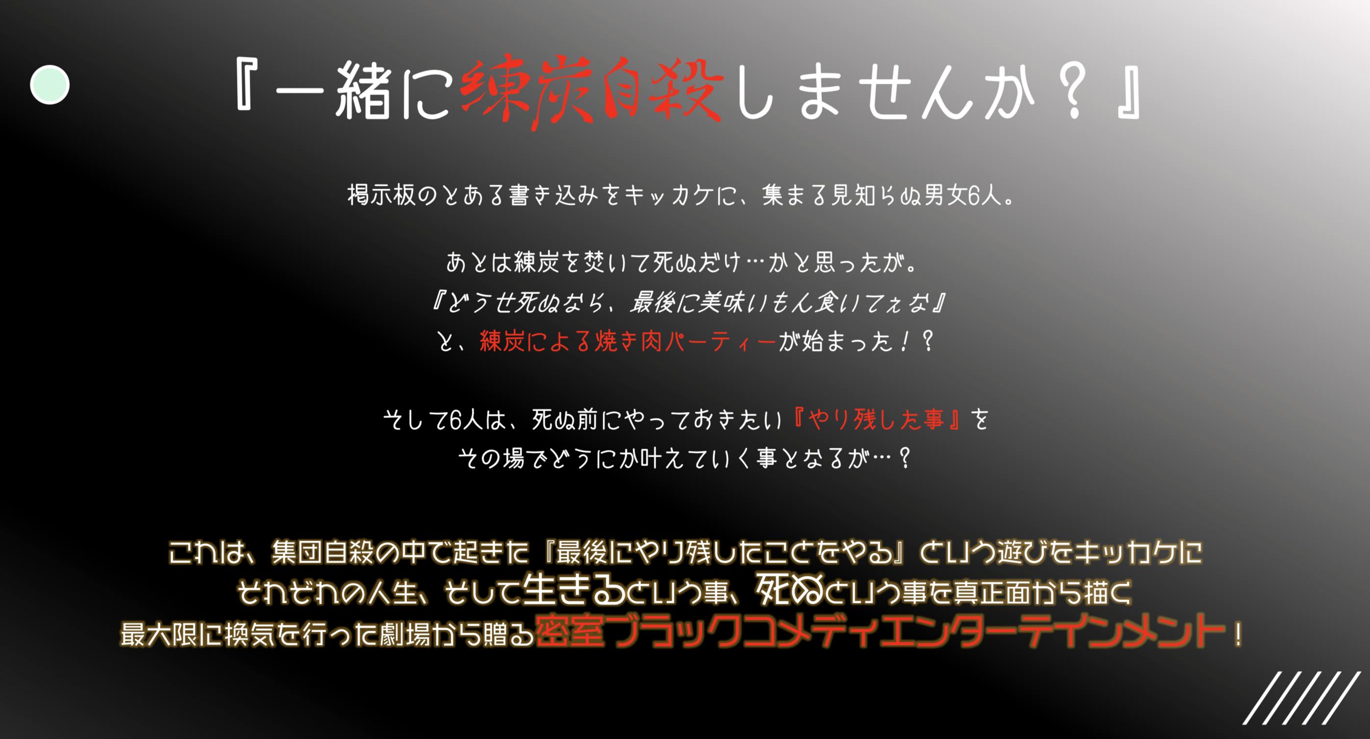 そして見ていただく皆様に、去年から誰もが味わっていない密室ブラックコメディの世界に没入していただければ、嬉しく思います。(もちろん換気はしっかり行いますが!)