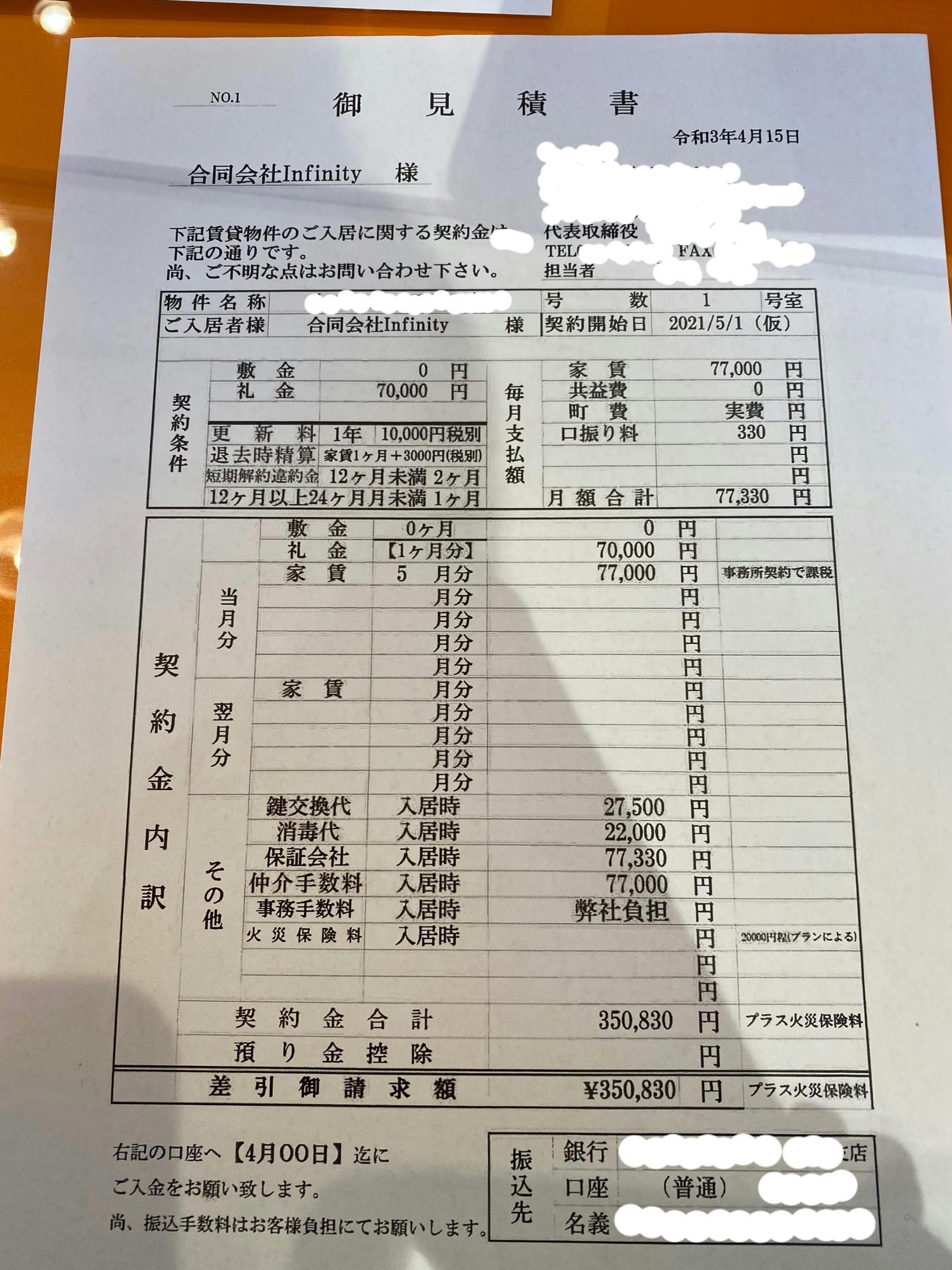 ※この物件だと初期費用、毎月の家賃が安くこれくらいで済むが検討中なので、この物件以外の検討中の物件だと初期費用がおおよそ50万円、家賃が毎月10万円前後から13万円となるので10万円で計算しても初期費用50万円、毎月の家賃10万円✖︎4ヶ月=40万円がかかります。