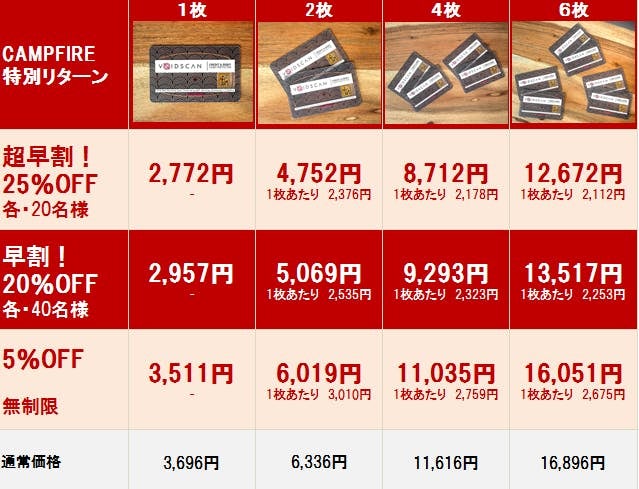 それぞれ数量限定の「超早割!」「早割!」と、「5%OFF」リターンをご用意しました。