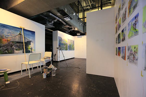 2017/08/30 17:04明後日からの同行三人展開催に向けて昨日今日と設営を行いました。写真は星智の2年前に描いた原画と公開制作を続けるためのエリア、写真中央に見えている開口部奥が太湯の映像作品上映のためのエリアです。 なかなかユニークな空間ができたのではないかと思います。 9/3には簡単なオープニングパーティを催したいと思います。作家2人が揃って居りますので、ぜひお越しいただければと思います。 引き続きよろしくお願いいたします! もっと見る公開制作の様子